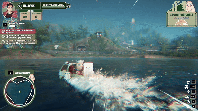 You play as a disgraced Yakuza member banished to a cursed island, left to see out your days rebuilding a once forgotten mascot agency. Your goal is to earn enough money to keep the other yakuza bosses at bay and in turn bring the island back to its former glories. Its a fairly surface level story but there is enough intrigue to see it through to the end and there are some fun characters that you meet with along the way. The highlight of which is obviously your mascot sidekick Pinky who steals the show with entertaining dialogue and short temper.